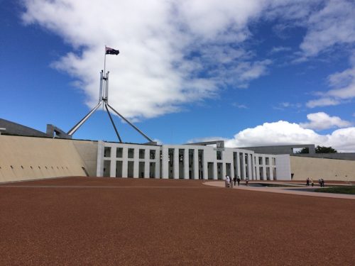 Am nächsten Morgen stellten wir fest, dass die Sonne Australiens wieder mit voller Leistung fuhr. Bereits in den Morgenstunden konnte man getrost auf einen Pulli verzichten. Wir beschlossen daher den schönen Tag zu nutzen und uns das Parliament House anzusehen. Nach einem großzügigen Spaziergang kamen wir dort an.