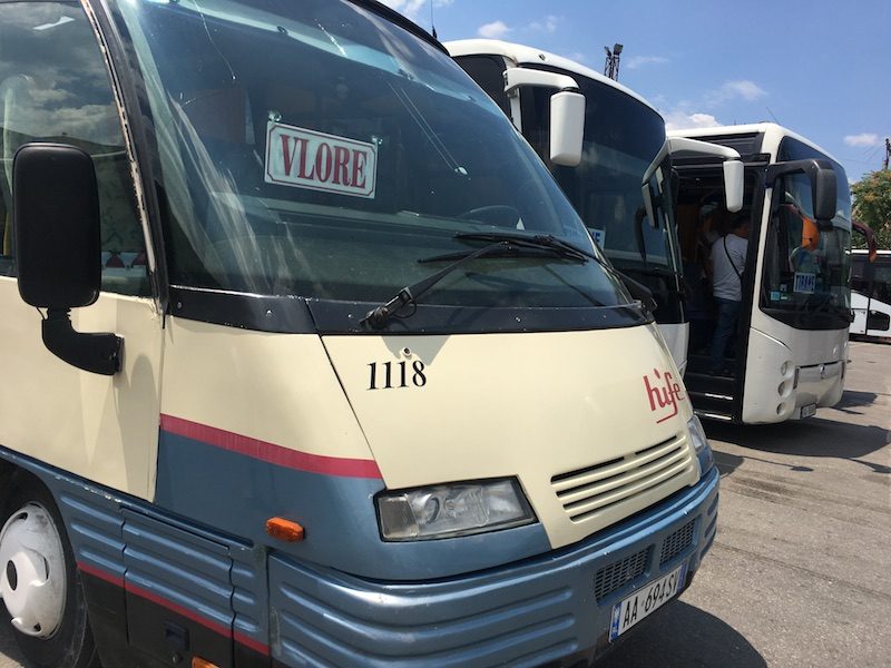 In Albanien wird das Busfahren erstmals richtig spannend. Es gibt keine Buspläne, keine richtigen Busbahnhöfe und auch die Qualität der Busse lässt eher zu Wünschen übrig. Häufig fahren die Busse an einem oder mehreren um das Zentrum gelegenen Plätzen ab. Der einfachste Weg diese zu finden ist sich durch zu fragen. Des Weiteren sollte man durchaus Zeit mitbringen und sich für den Reisetag nichts Weiteres vornehmen. Der Bus hält immer wieder irgendwo im Nirgendwo (so kommt es einem zumindest vor), um Leute ein- oder aussteigen zu lassen, den Motor abkühlen zu lassen, für eine Pipipause oder auch mal, weil sich der Busfahrer einen Kaffee holen will. Für eine Busfahrt von etwa 100 km kann man also problemlos etwa vier bis sechs Stunden einplanen. Will man unter der Fahrt an einem sehenswerten Ort aussteigen, sollte man sich auch über das weiterkommen grundsätzlich im Klaren sein, da die Taklung der Busse keiner Regelmäßigkeit unterworfen ist. Alternativ bringt man einfach Zeit mit und wartet in einem Café bis der Bus mit der richtigen Richtung vorbei kommt. Der Preis für die Fahrt wird direkt mit dem Fahrer geklärt. An während der Fahrt rauchenden oder telefonierenden Fahrern sollte man sich auch nicht stören.