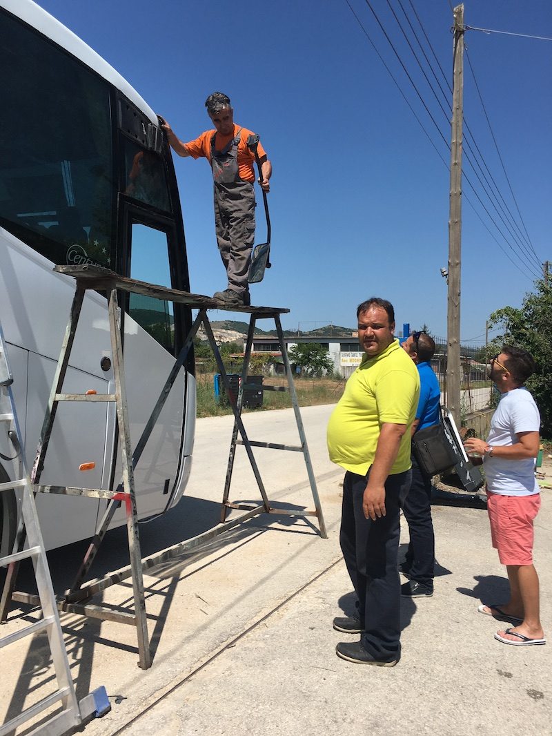 Unsere Fahrt hätte eigentlich ca. sieben Stunden dauern sollen, am Ende waren es aber annähernd zwölf. Vor allem ein ungeplanter vierstündiger Zwischenstop im Niemandsland zwischen Albanien und Griechenland hatte zu den derartigen Verzögerungen geführt, da unser Fahrer seinen Bus bei der Einreisekontrolle in die EU leicht ramponiert hatte (Außenspiegel weg, Tür verzogen etc.). Die Reparatur erfolgte dann Postwenden bei einer Werkstatt im nahegelegenen Ioannis. Wobei Reparatur vielleicht der etwas falsche Ausdruck ist, da lediglich ein anderer uralter Spiegel mittels Klebeband an den Überresten des Originals fixiert wurde.