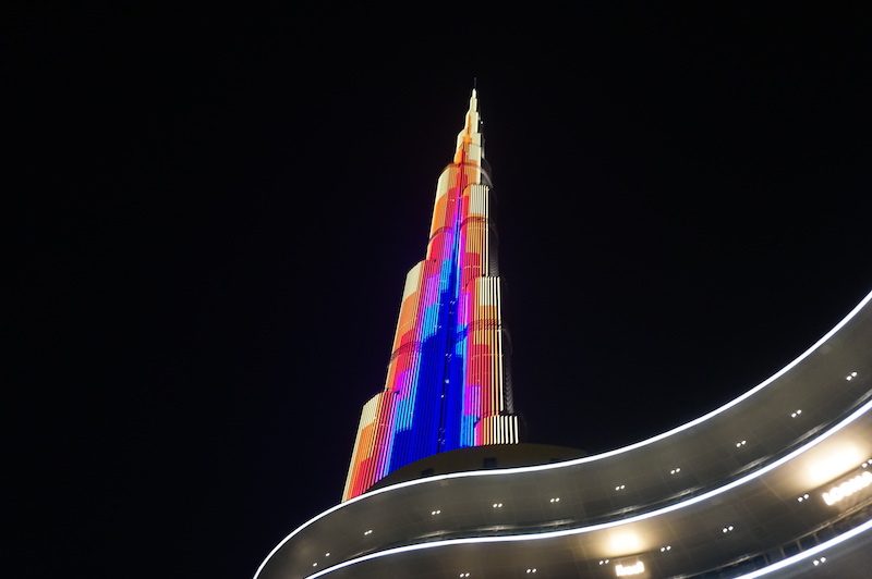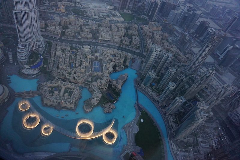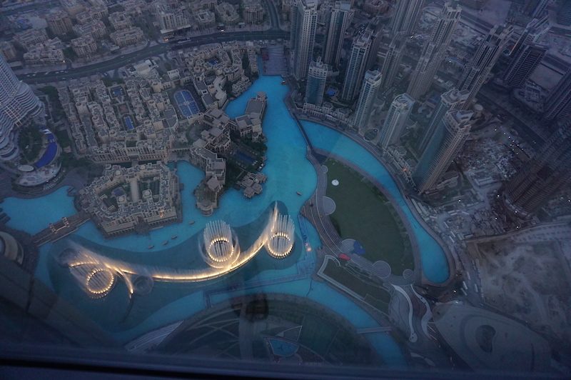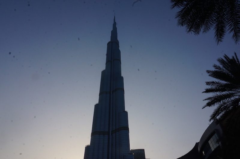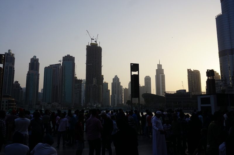 So fuhren wir mit der Metro los in Richtung der Station „Dubai Mall / Burj Khalifa. Die angenehmen 20 Grad in der Bahn waren kein Vergleich zur Hitze im Freien, sodass wir glücklich und erstaunt waren, als wir feststellten, dass der Weg zwischen der Haltestelle und unserem Ziel vollständig durch einen Tunnel verlief und wir kein einziges Mal an die frische Luft mussten. Nach etwa einem Kilometer durch den Tunnel und über diverse Rollbänder, waren wir schließlich an unserem Ziel. Die Größe dieses Gebäude sprengt jegliches Vorstellungsvermögen, sodass wir die nächsten Stunden zuerst einmal damit verbrachten wirr umherzulaufen. Neben einem Wasserfall kamen wir vorbei an einer Eisbahn, einem Aquarium mit Rochen und drei Meter langen Haien und gefühlt jedem Geschäft, dass wir irgendwo auf der Welt schon einmal gesehen hatten. Nachdem wir die oberen Stockwerke erschlagen von dieser Mannigfaltigkeit durchstreift hatten, kamen wir am frühen Abend schließlich auf der Plaza vor der Mall an und hatten das erste Mal den Burj Khalifa und den davor liegenden Pool vor Augen. Bei immer noch Temperaturen von weit jenseits der 40°C verweilten wir ein paar Minuten im Schatten des Wolkenkratzers, wobei es eigentlich egal war ob Schatten oder Sonne. Es war einfach nur unerträglich heiß. Der Anblick ließ uns allerdings für ein paar Minuten die Temperaturen vergessenen und wir blickten nur gebannt nach oben, wobei die umliegenden „nur“ 200 Meter hohen Wolkenkratzer aussahen wie Bungalows.