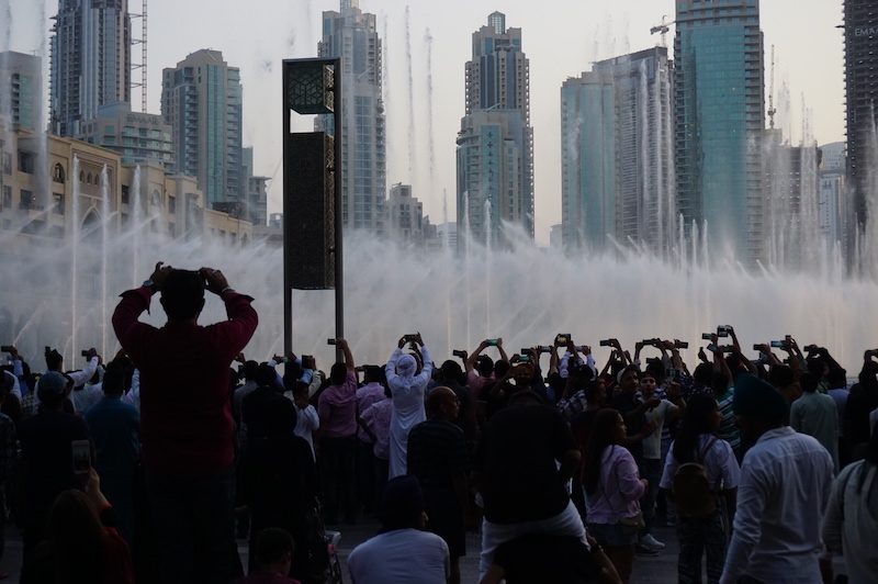 Nach einer Weile ertönte aus den Lautsprechern um uns herum eine arabische Musik und wir bemerkten, dass sich der Platz vor der Teichanlage allmählich mit Menschen füllte. Es war etwa halb sieben und vor unseren Augen fing das Wasserspiel an, Fontänen von 40 m Höhe in die Luft zu schießen. Steffi, die das Wasserspiel vor dem Bellagio in Las Vegas bereits gesehen hatte, stellte mit großen Augen fest, dass das quasi ein seichtes Teichfontänchen gegenüber der Show war, die wir gerade zu sehen bekamen.