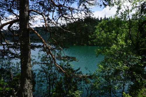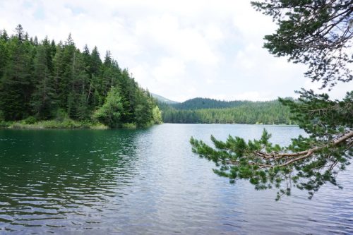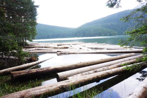 Am nächsten morgen hatte sich das Wetter ein wenig gebessert, sodass wir uns nach einem kurzen Frühstück mit Porige und Banane, sowie einem starken Kaffee (der vorherige Abend hatte Spuren hinterlassen) aufmachten um den Crno Jezero zu umrunden. Eigentlich hätte der Eintritt in den Durmitor Nationalpark 3,- € pro Person gekostet. Da unser Campingplatz aber ca. 30 Minuten Fußweg abseits des Haupteingangs lag, konnten wir über einen Wanderweg direkt von unserem Zeltplatz in den Nationalpark laufen und sparten uns diese Kosten.