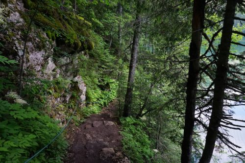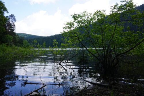 Am Schwarzen See, oder besser den schwarzen Seen (eigentlich sind es zwei Seen die über einen Durchfluss zwischen zwei Bergkämmen verbunden sind) angekommen, machten wir uns an die Umrundung. Der anfänglich gut ausgebaute Weg um den See wurde mit der Zeit mehr und mehr zu einem Trampelpfad. Die Niederschläge der letzten Tage hatten den Seespiegel deutlich ansteigen lassen, sodass der Hauptweg von ihm verschluckt worden war.