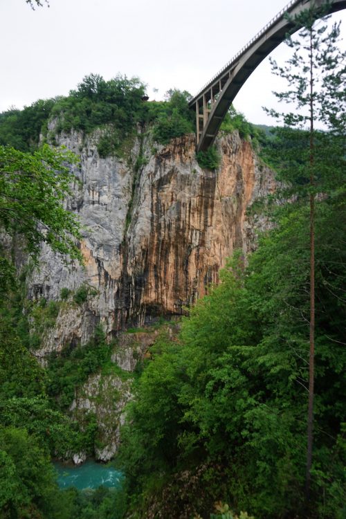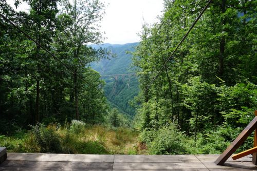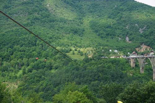 In der Früh um neun machten wir uns mit unseren beiden Fahrern Claire und Benjamin aus der Bretagne auf den Weg zur Taraschlucht. Eine der tiefsten Schluchten Europas. Wir hielten an der Brücke über die Tara, da wir erfahren hatten, dass es hier eine günstige und sehr lange Zipline über die Schlucht gab. Als wir ankamen stellten wir fest, dass es nicht nur eine, sondern mehrere waren und wir uns vor lauter Anbietern erst einmal orientieren mussten.