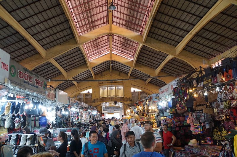 Wir ließen uns weiter durch die Stadt, bis zum Distrikt 1 treiben und kamen zum Ben Thanh Market, in dem es allerlei Kleidung und Schmuck, aber auch Lebensmittel, wie Fisch, Obst, Gemüse und Kaffee zu kaufen gibt. Wir bummelten ein wenig durch die vielen Stände, bis wir irgendwann genug davon hatten und weiterzogen.