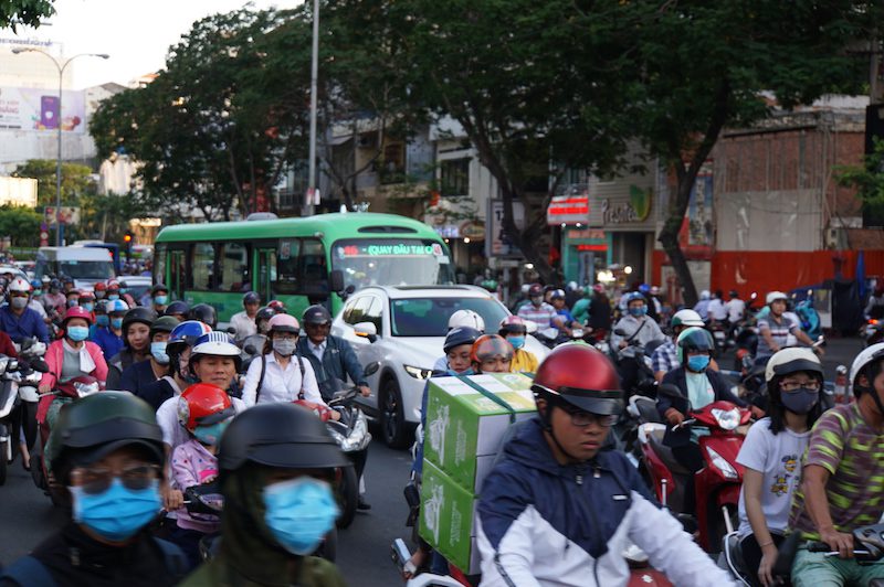 Mit dem Bus ging es nach langem Warten auf das Visum von Phnom Penh aus endlich in Richtung Vietnam. Nach etwa vier Stunden erreichten wir die Grenze und wurde aufgefordert aus dem Bus zu steigen, um samt Gepäck zu Fuß aus Kambodscha auszureisen und in Vietnam einzureisen. Dabei leitete uns ein Angestellter des Busunternehmens den Weg und kaum eine halbe Stunde später waren wir zurück im Bus und konnten weiter fahren zu unserem Ziel Ho Chi Minh Stadt. Nach weiteren zwei Stunden Fahrt erreichten wir endlich den Busbahnhof und machten uns von dort aus zu Fuß auf den Weg zu unserem Hostel.