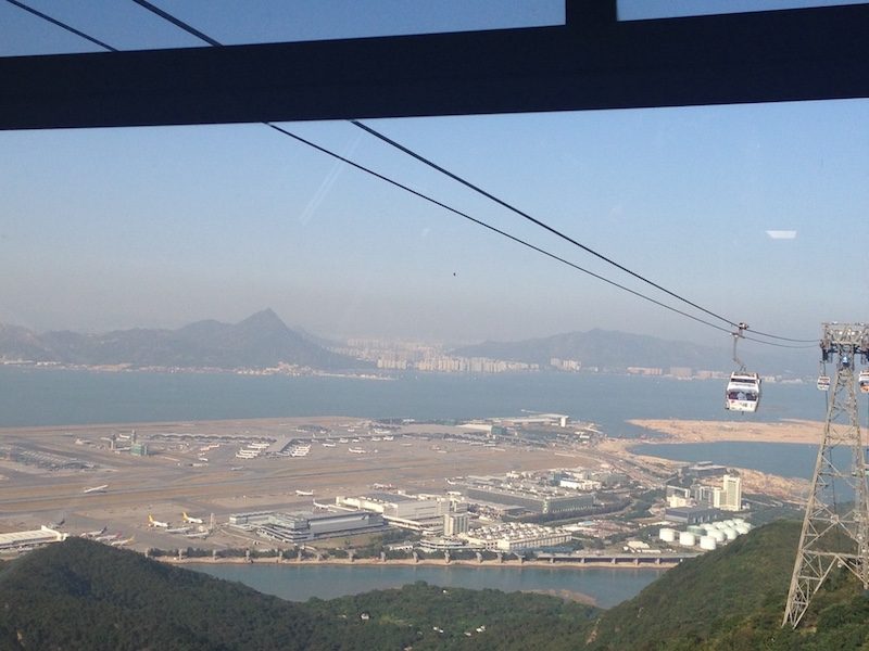 Das sehr touristisch ausgebaute Areal dient bis zur heutigen Zeit als buddhistisches Kloster. Nach einem ausgedehnten Rundgang durch die Tempelanlage (kostet 60,- HK$) und einem Besuch der Plattform zu Buddhas Füßen ging es mit Ngong Ping 360 Seilbahn wieder talwärts. Die Bahn verläuft durch den Lantau Country Park und gibt immer wieder herrliche Blicke auf das Grüne Hongkong frei. Auch ist der Blick hinüber zum Flughafen nicht zu verachten.