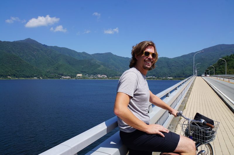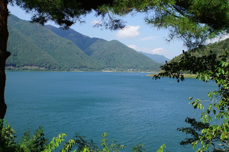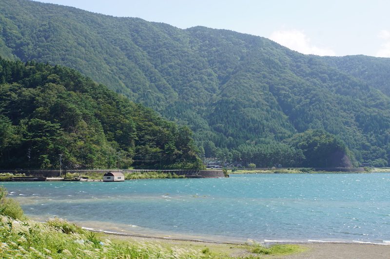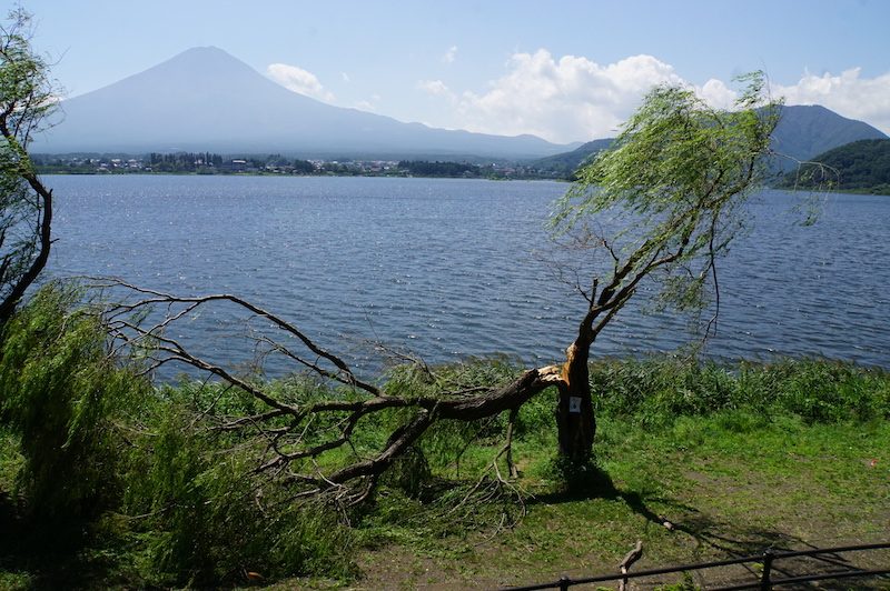 So fuhren wir ausgehend von unserer Unterkunft über die nahegelegene Brücke über den Lake Kawaguchiko und fanden einige tolle Aussichtspunkte auf den knapp 3.800m hohen Vulkan. Wir radelten am See entlang, vorbei an entwurzelten Bäumen und Arbeitern, die gerade dabei waren die Sturmschäden des Vortages zu beseitigen.