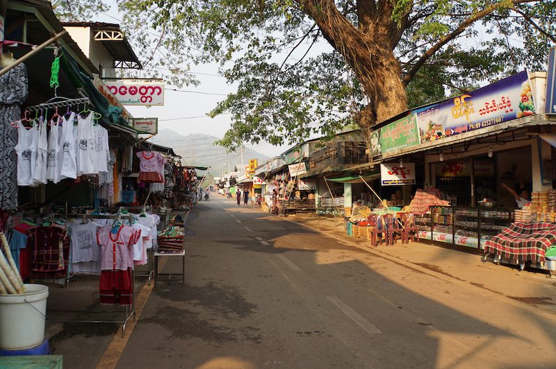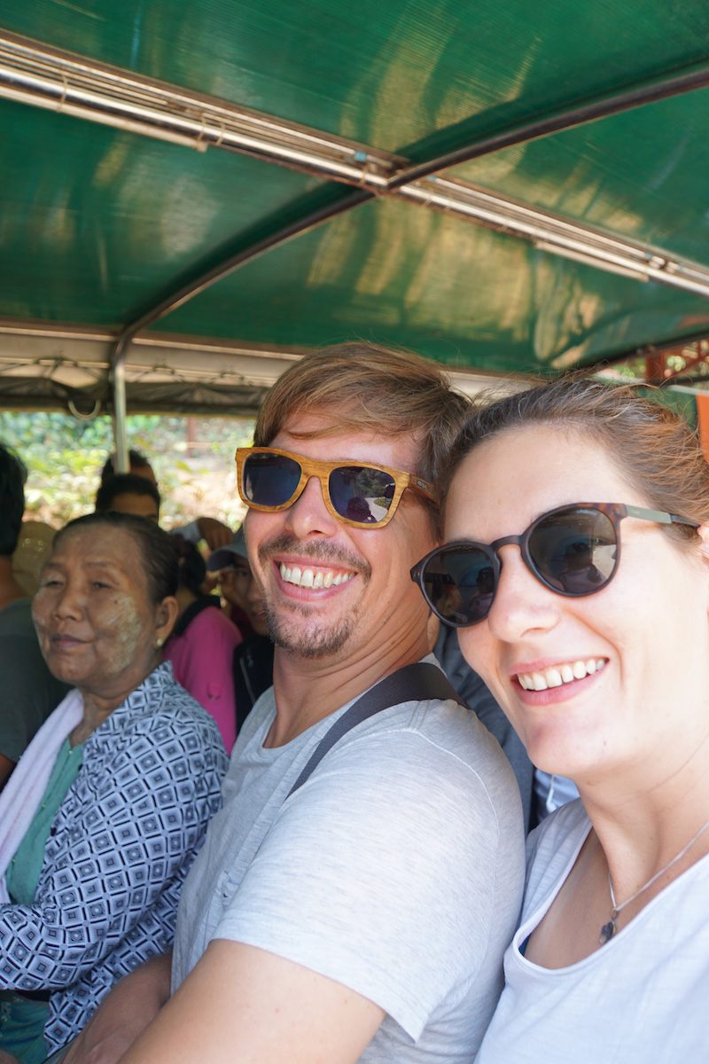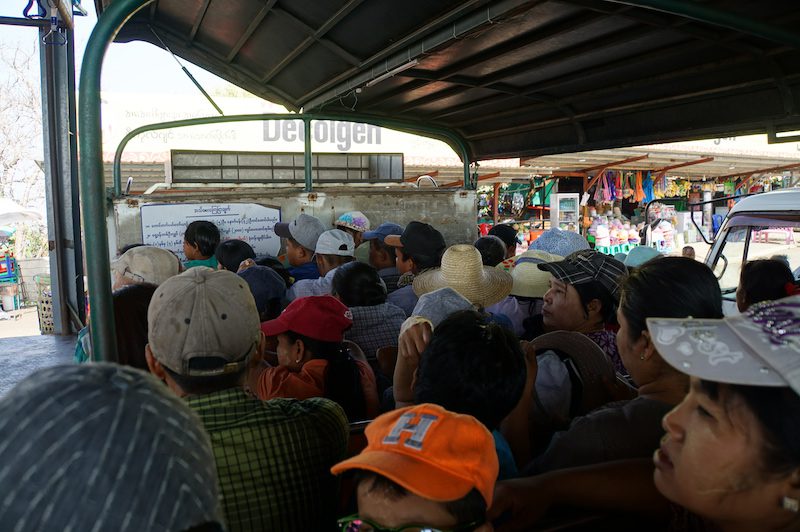 Zurück im Truck das gleiche Spiel wie bei der Fahrt nach oben. Eingequetscht zwischen Burmesen (wir sahen an diesem Tag fast keine ausländischen Touristen), ging es den Berg wieder hinunter und wir kamen durchgeschüttelt wieder in Kinpun an. Dort gönnten wir uns noch einen Snack und einen Kaffee, bevor wir den Hotelbetreiber anriefen und uns wieder abholen ließen.