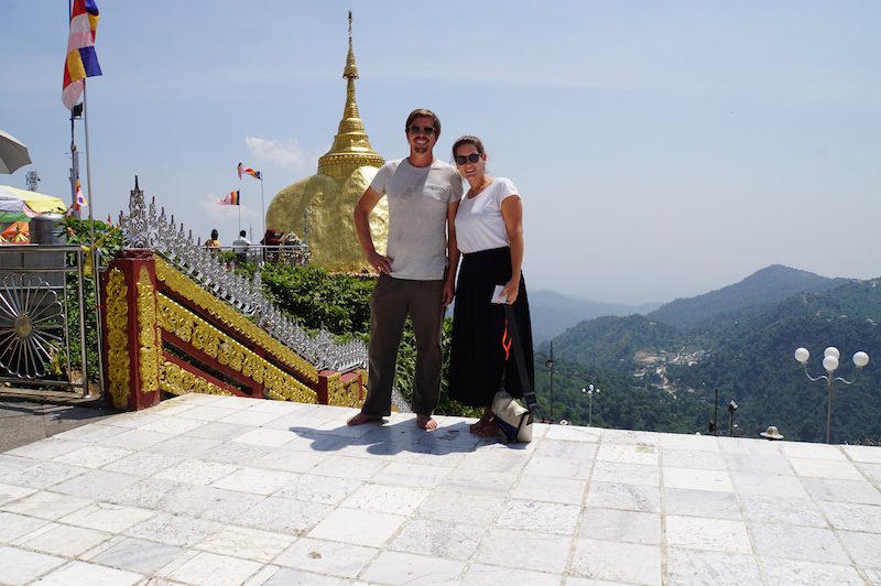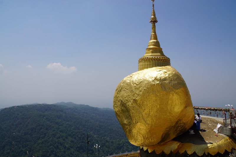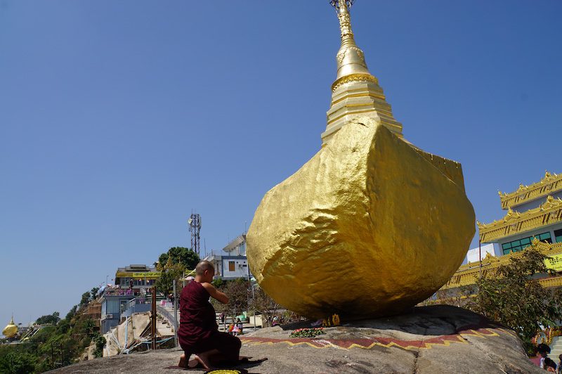 Wir staunten wirklich, als wir den Felsen endlich sahen, denn man könnte tatsächlich meinen, dass er jeden Augenblick hinunterfällt und beobachteten dabei die Männer, die weiteres Blattgold spendeten und damit den Felsen beklebten. Direkt am Fels sind keine Frauen erlaubt.