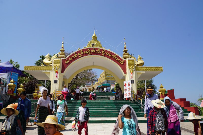 Endlich am Ziel angekommen, liefen wir gleich in Richtung des goldenen Felsens. Der Weg führte an unzähligen Verkaufsständen vorbei, bis wir an ein Büro kamen und aufgefordert wurden, einzutreten. Wie sich herausstellte, ist der Besuch des goldenen Felsens nur für Burmesen kostenlos. Als ausländischer Tourist muss man ein Ticket für 10.000 MMK (umgerechnet knapp 6 Euro) erwerben und sich dieses auch umhängen, um das Gelände zu betreten.