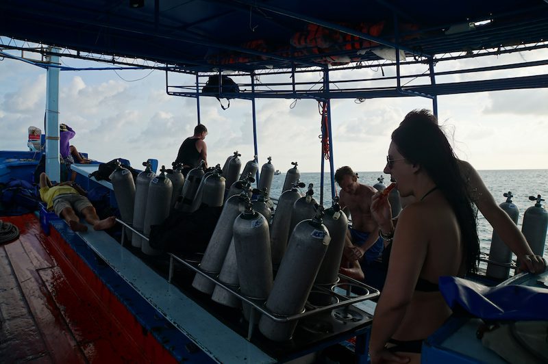 Um 5:00 Uhr klingelte dann am nächsten Tag bereits der Wecker und wir machten uns wenig später mit den Rollern auf zur Tauchschule. Max packte für uns das Equipment und schon ging es, in immer noch vollkommener Dunkelheit, Richtung Boot. Während das Boot ablegte und zum ersten Tauchspot fuhr, ging die Sonne langsam auf. Ein netter Nebeneffekt des frühen Aufstehens.