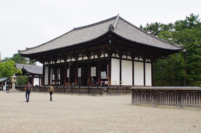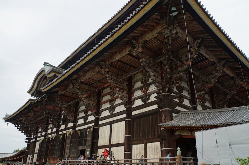 Nach etwa 20 Minuten Fußmarsch kamen wir beim wohl berühmteste Gebäude in Nara, dem Todai-Ji an. Der Name bedeutet übersetzt soviel wie „Großer Tempel des Osten“. Dies kann man auch wortwörtlich nehmen, da die Haupthalle der buddhistischen Tempelanlage das größte nur aus Holz gebaute Gebäude der Welt ist. Zudem findet man in der Haupthalle einen achtzehn Meter hohen und aus 450 Tonnen Kupfer bestehenden Buddha (Daibutsu).