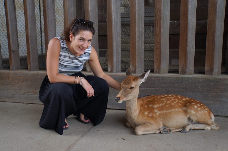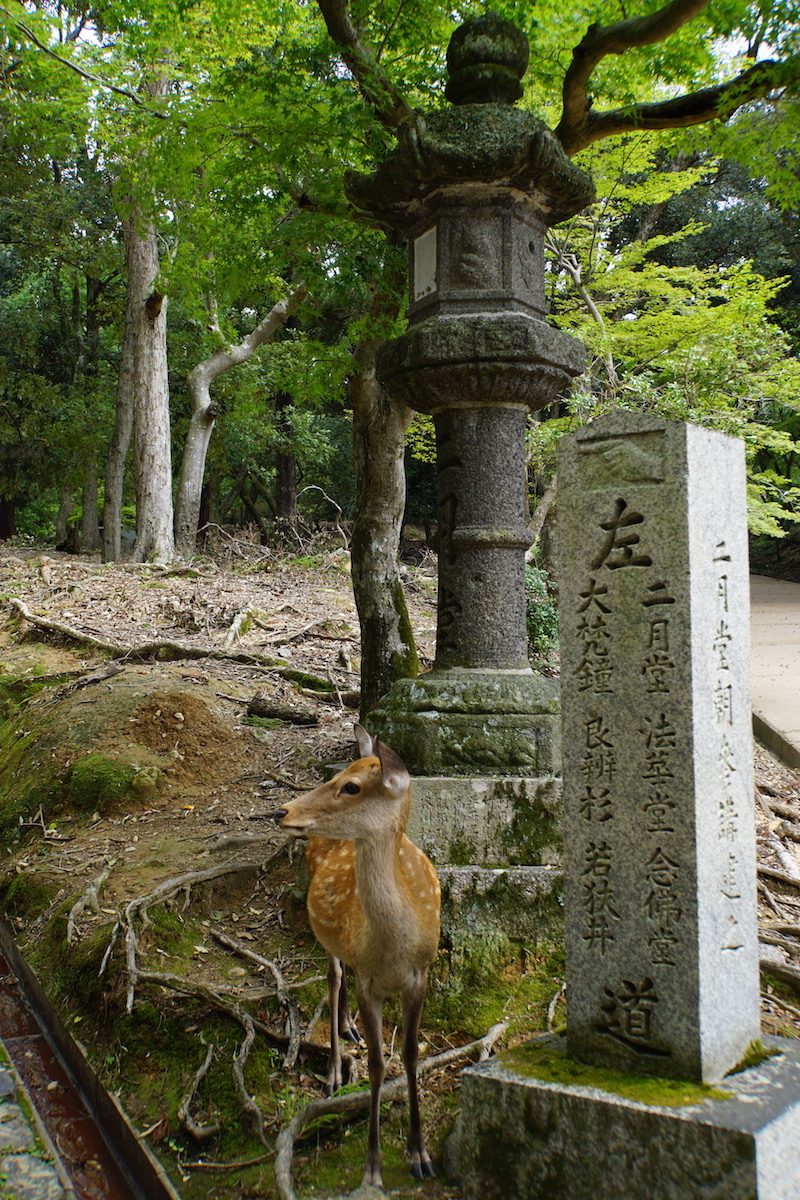 Schon auf dem Weg zur ersten Tempelanlage Kofuku-Ji begegneten uns die ersten Rehe und Hirsche auf der Straße und den Grünstreifen am Rand.