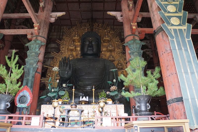 Nara eignet sich hervorragend als Tagesausflug von Kyoto oder wie in unserem Fall von Osaka, da es von beiden Städten in etwa einer Stunde mit dem Zug erreichbar ist. In Nara selbst befinden sich viele Tempel wie auch der Todai-Ji Schrein, der eine 18m hohe Buddha Statue beherbergt und zum UNESCO Weltkulturerbe zählt.
