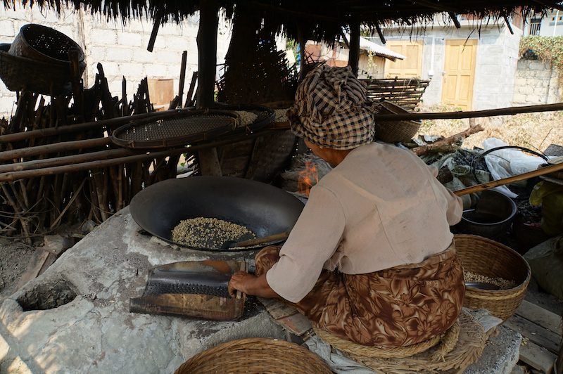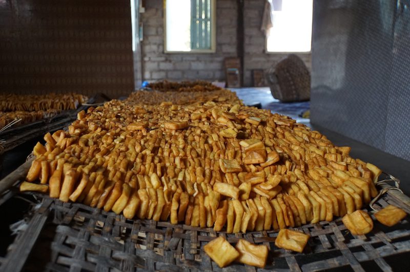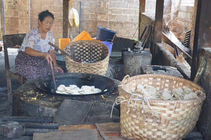 Hier hielten wir uns nicht lange auf, besichtigen die buddhistische Stätte nur kurz, tranken etwas und machten uns auf den weiteren Weg, der uns zum nächsten und wohl auch interessantesten Ziel des Tages führte. Wir stoppten an einer Tofumanufaktur, dem Tofu Palace und bekamen dort als erstes natürlich auch haufenweise Tofu vorgesetzt und zwar das beste Tofu, was wir jemals in unserem Leben gegessen haben. Im Anschluss wurde uns die Herstellung des Tofus von einem, wie sollte es anders sein, super netten Burmesen gezeigt. Er führte uns durch die kleinen Hütten, in denen gerade Tofu über offenen Feuer frittiert wurde und erläuterte uns die Herstellung. Unsere Augen fingen schon gleich nach dem Eintreten zu tränen an, da alles voller Rauch war. Kaum vorstellbar, dass Menschen hier den ganzen Tag sitzen.