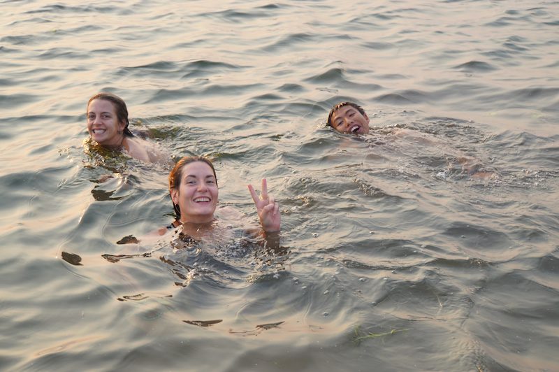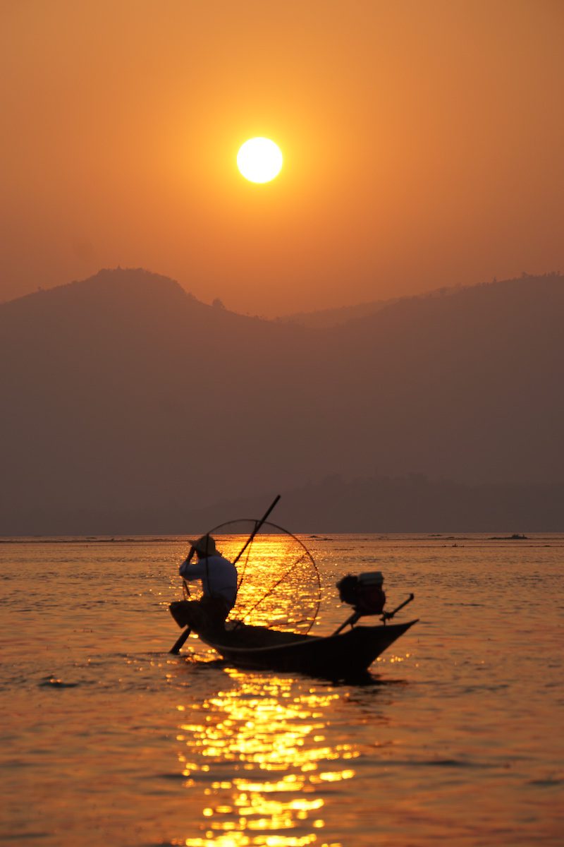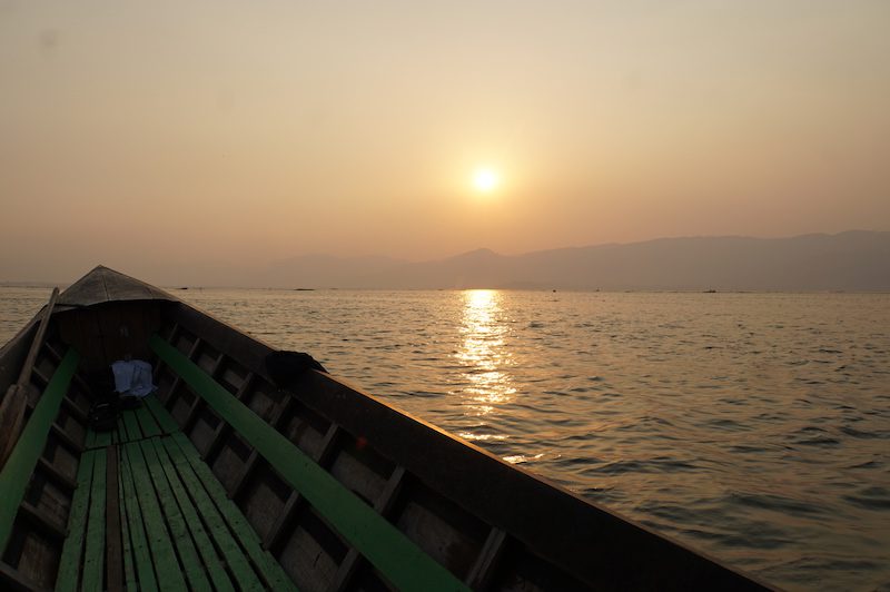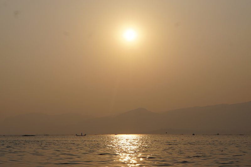 Als die Sonne langsam anfing unterzugehen, fuhren wir wieder auf den See, denn wir wollten die einmalige Chance, den Sonnenuntergang auf dem Inle See zu sehen, natürlich nicht auslassen. So suchten wir uns ein gutes Plätzchen, ankerten das Boot und beschlossen, bei untergehender Sonne noch zum Baden in den Inle See zu springen.