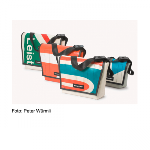 Die Schweizer Firma Freitag stellt Hand- und Tragetaschen als Unikate aus recycelten LKW-Planen sowie alten Schläuchen und Sicherheitsgurten her. Die Tasche lässt sich in der Größe variieren und durch den breiten Riemen aus Sicherheitsgurt besticht sie auch bei größerem Gewicht durch ihren Tragekomfort. Sie ist sicher, kann nicht durchschnitten werden und ein lautloses Öffnen ist ebenfalls nicht möglich.