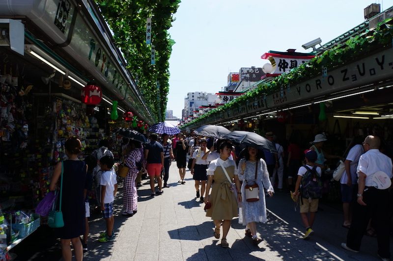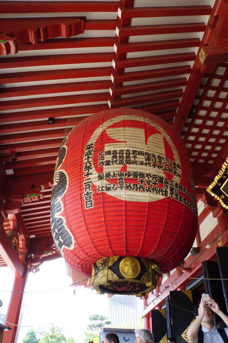 Wir fuhren also von unserer Unterkunft nach Asakusa, um hier den ältesten und bedeutendsten Tempel Tokios, den Senso-Ji, zu besuchen. Dort angekommen, liefen wir erst einmal durch das Tempelviertel mit den vielen kleinen Geschäften und erreichten die Tempelanlage durch das Haupttor.