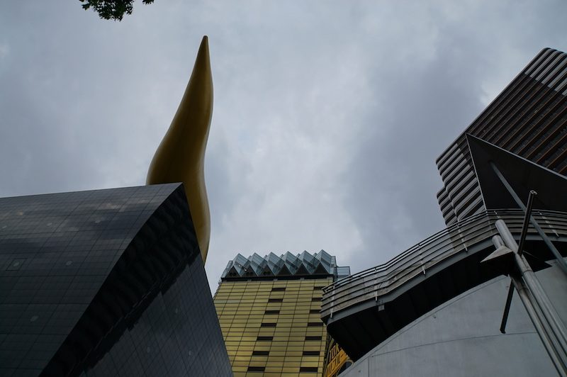 Im Hintergrund konnten wir bereits unser nächstes Ziel, den Tokio Skytree, erkennen. Der Skytree ist nach dem Burj Kalifa zweithöchste Gebäude der Welt. So liefen wir vom Senso-Ji eine knappe halbe Stunde zuerst über den Sumida River und im Anschluss vorbei an der Asahi Beer Hall (ein von Philippe Starck designtes Gebäude, bei Tokios Bevölkerung eher als goldenes Stück Sch… bekannt) und durch verschiedene Wohngebiete bis wir den Tokio Skytree erreichten.