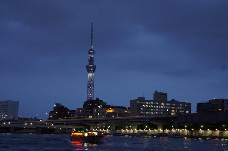 Da wir ein paar Tage zuvor auf dem Burg Kalifa in Dubai waren, sparten wir uns die gesalzenen Eintrittspreise für die Aussichtsplattform. Auch da der Himmel mittlerweile zugezogen hatte und die Sicht eh nicht mehr so spannend war. Wir bummelten ein Weilchen durch die zugehörige Mall und liefen in der anbrechenden Abenddämmerung entlang des Sumida Rivers zurück in Richtung Zentrum. Als wir das Luxusviertel Ginza erreichten, überraschte uns ein Wolkenbruch, sodass wir beschlossen den Tag zu beenden und fuhren zurück zu unserer Unterkunft. Beim nahegelegenen Supermarkt kauften wir uns noch ein Abendessen und ließen den Abend entspannt bei Sushi und Bier ausklingen.
