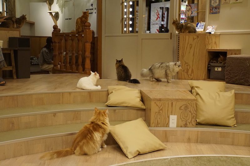 Auf der anderen Straßenseite entdeckten wir bei einer kurzen Rast ein Katzencafe. Da ein Besuch in einem solchen Etablissement auf Steffis Wunschliste für Japan stand, beschlossen wir kurzerhand diesem einen Besuch abzustatten.