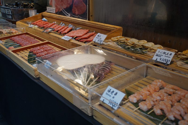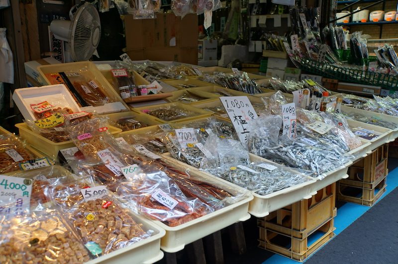 Nach einer halben Stunde und nur einem Bruchteil des Inner-Markets verließen wir diesen wieder, da Steffi mittlerweile von dem ganzen Fisch etwas übel geworden war. Es war ja immer noch früh. So bummelten wir durch den äußeren Bereich und naschten reichlich an den allerlei Probierproben, welche an den Ständen bereitstanden. Neben verschiedenen Ständen mit allerlei japanischen Frühstücksvarianten, wie warmen, süßem Eierstich fanden wir auch diverse Stände mit japanischen Snacks, die vorwiegend aus getrockneten Algen oder auch getrocknetem Fisch bestanden. So probierten wir z.B. getrockneten, in Streifen geschnittenen Oktopus, das japanische Pendant zu unseren heimischen Salzstangen oder auch getrocknete Krabben, quasi ein Chipsäquivalent. Mal lecker, mal für den europäischen Gaumen eher gewöhnungsedürftig.