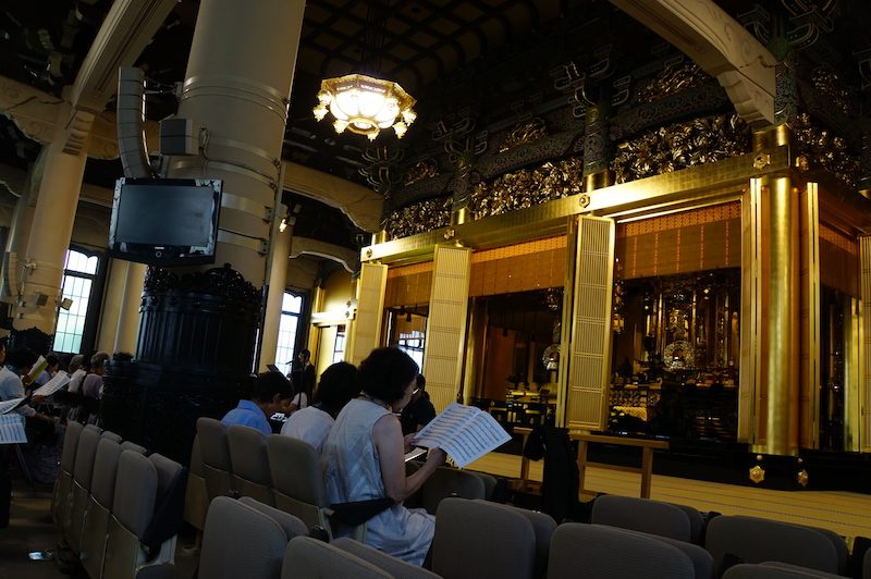 Als wir dann doch noch etwas Hunger bekamen, kauften wir uns als Frühstück ein aus Thunfisch, einer riesigen Muschel, die wir nicht kannten und Makrele bestehendes Sashimi. Zufrieden (Steffi war auch nicht mehr ganz so schlecht) und gesättigt von dem morgendlichen rohen Fisch, gönnten wir uns erstmal noch einen Kaffee, um im Anschluss den angrenzenden buddhistischen Tempel zu besuchen und um hier, zufälligerweise einer Chorprobe beizuwohnen.