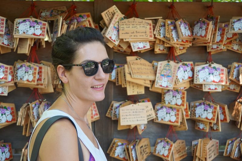 Der kleine Tempel besticht durch eine Vielzahl an Winkekatzen, welche als Opferdarbietungen von den Gläubigen gekauft und mit Wünschen versehen neben den Schreinen aufgestellt werden.