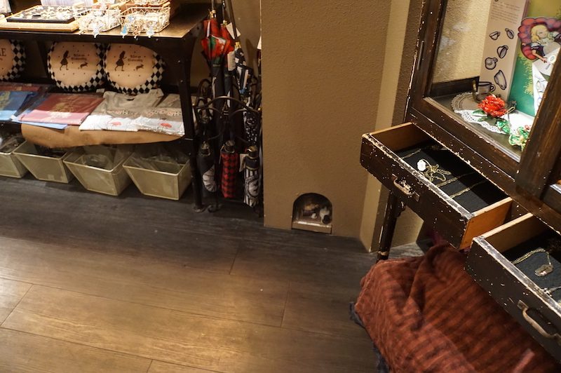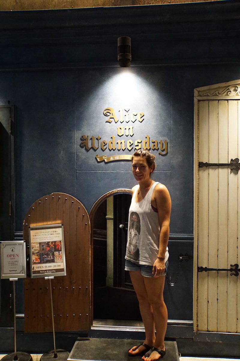 Der Lärm in dieser Spielhalle ist allerdings ohrenbetäubend, sodass wir diese nach etwa einer Stunde hörgeschädigt wieder verließen, um unser letztes Ziel des Tages, die Catstreet, eine Straße für Vintage und Cosplay im Szeneviertel Harajuku zu besuchen. Aufgrund der Öffnungszeiten der Geschäfte hatten wir dies bei unserem ersten Besuch dort nicht mehr geschafft. Wir liefen nach unserer Ankunft vorbei an dem gewohnten Bad aus bunten Leuchtreklamen und ausgefallenen Modegeschäften. Auf etwa halber Strecke entdeckten wir einen kleinen Laden für „Alice im Wunderland“ Artikel und krochen durch die winzige Tür in den Laden.
