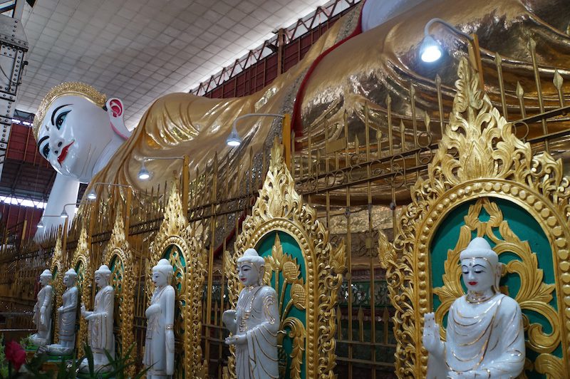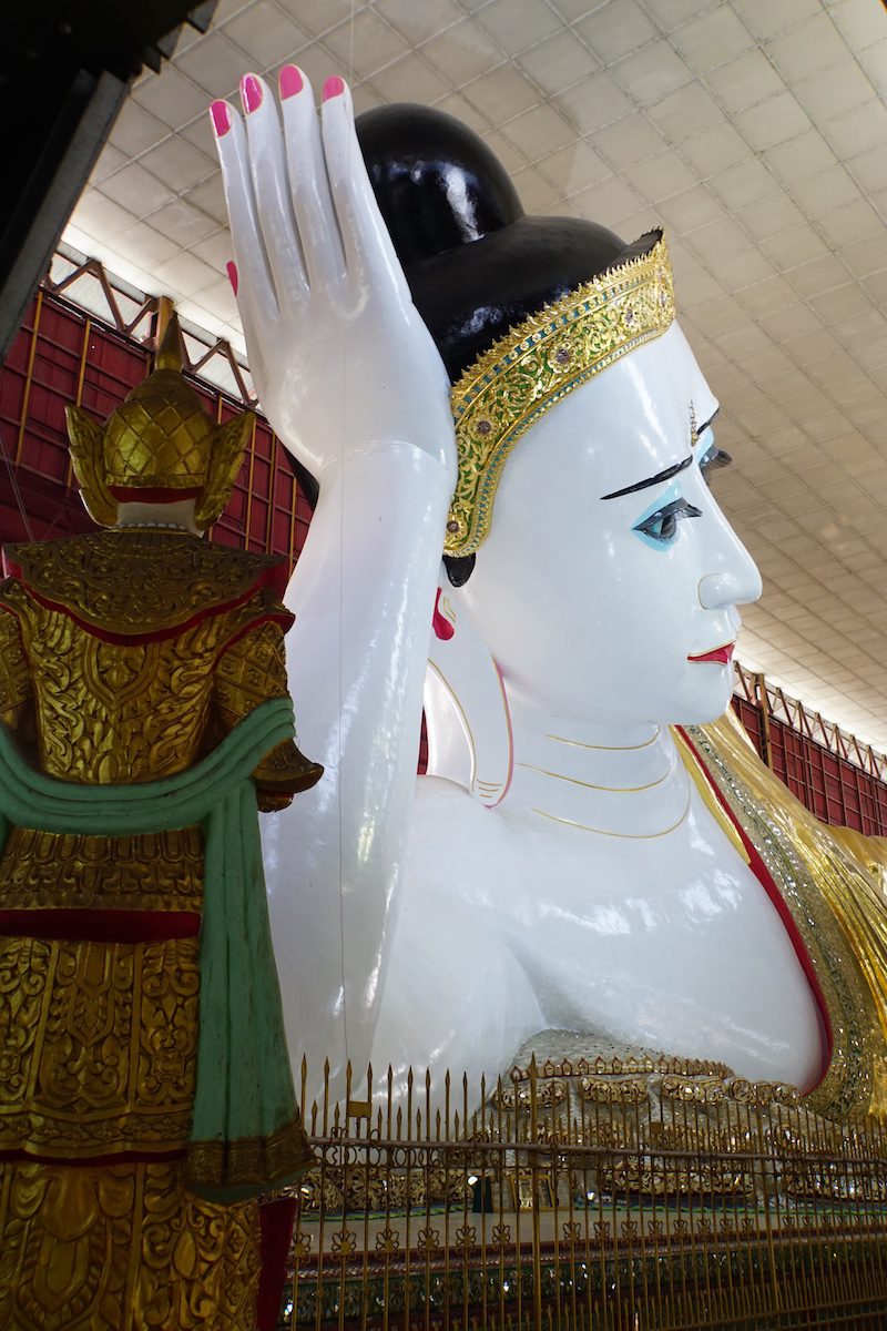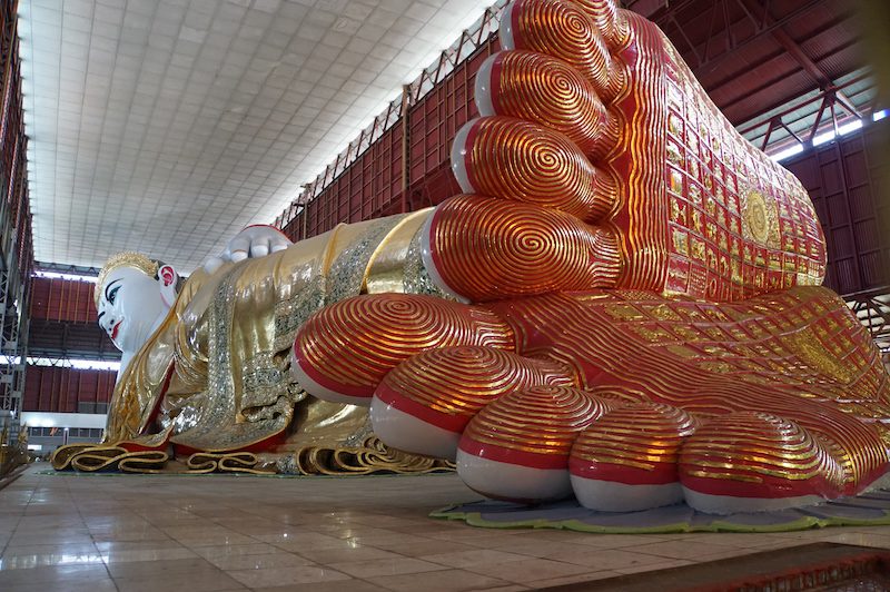 Dort angekommen, zogen wir, wie vor jedem Tempel unsere Schuhe aus und liefen in Richtung des liegenden Buddha in den Chaukhtatgyi Tempel. Der beeindruckende Buddha ist 66 Meter lang und zählt damit zu den größten Buddha Figuren des Landes.